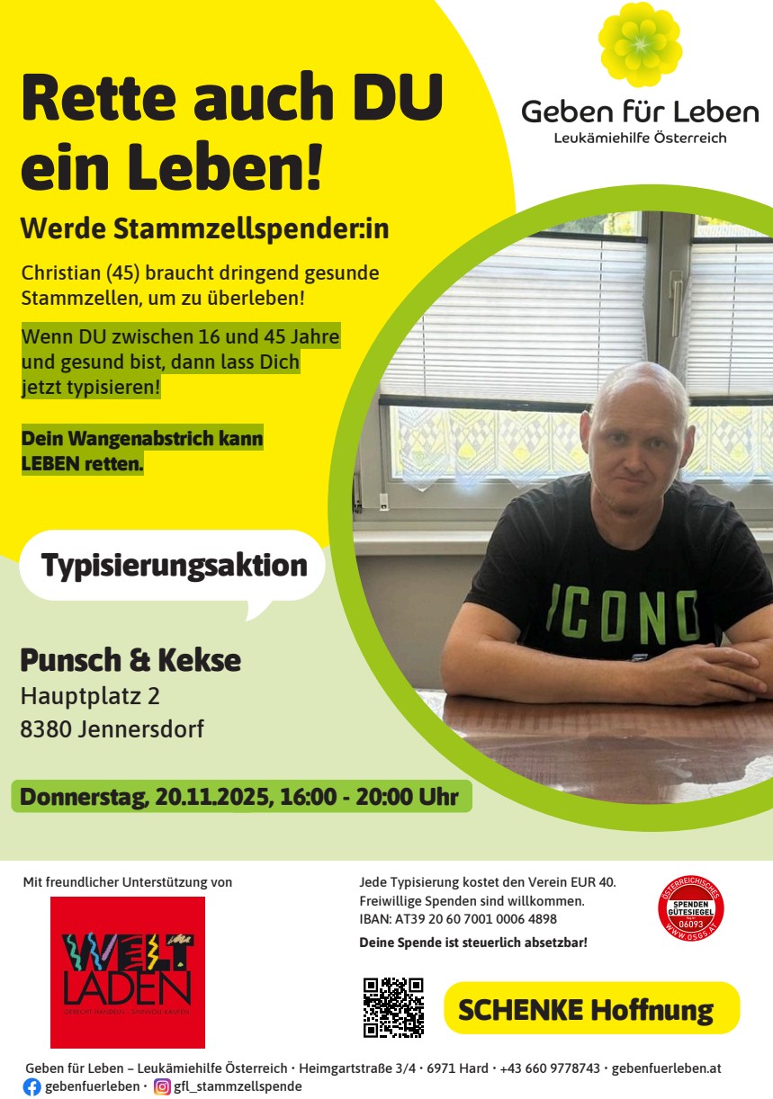• Ausgehend von engagierten Mitwirkenden ist vom Team des Weltladen am Do, den 20.11.2025 von 16.00 bis 20.00 Uhr eine tolle Initiative geplant: Typisierungsaktion Stammzellenspende – Charity für eine junge Familie aus Jennersdorf Wenn DU zwischen 16 und 45 Jahre und gesund bist, dann lass Dich jetzt typisieren! Dein Wangenabstrich kann LEBEN retten.