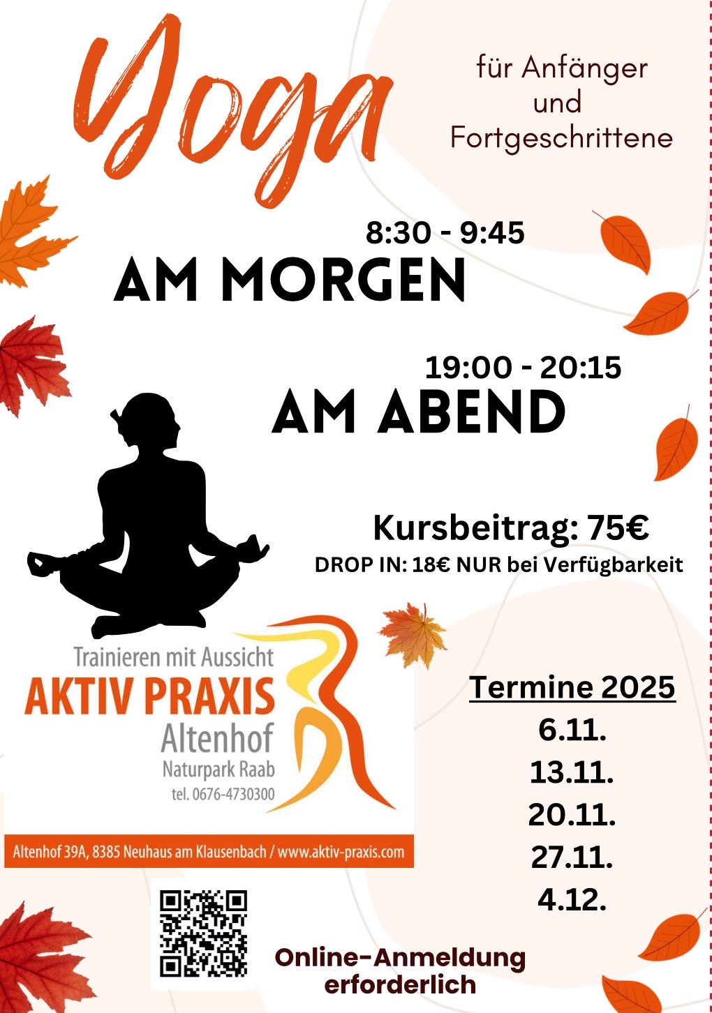 Unsere Kursserien im Winter – YOGA (am Morgen oder am Abend) Liebe Yoginis und Yogis!🧘‍♀️🧘‍♂️Unsere nächste Kursserie nach den Herbstferien startet am 06.11.2025. Inhalte: Dynamische Asanaabfolgen zur Mobilisation mit Atem- und MeditationsübungenZielgruppe: Yogaanfänger & FortgeschritteneDauer: 75 minGruppenleiterinnen: Iris Schöndorfer, Kerstin KrejciTermine: donnerstags 08:30 – 9:45 Uhr ODER 19:00-20:15 UhrTerminserie: 06.11. / 13.11. / 20.11. / […]
